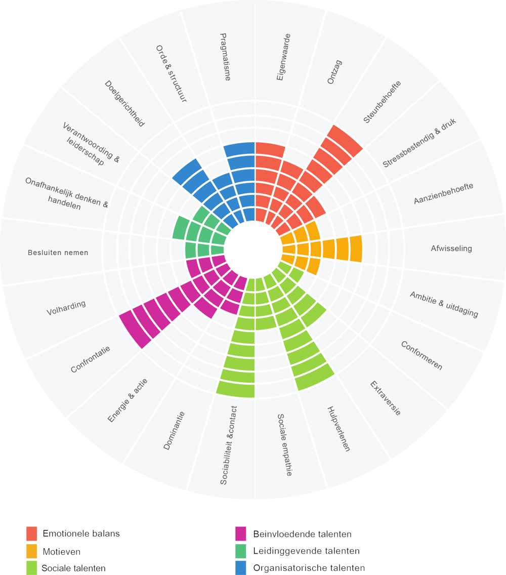 De talentenanalyse geeft een rapport over de persoonlijkheid van een kandidaat en bevat 44 talenten, 22 drijfveren en de aanleg voor 53 competenties, op een positieve en niet-oordelende manier.